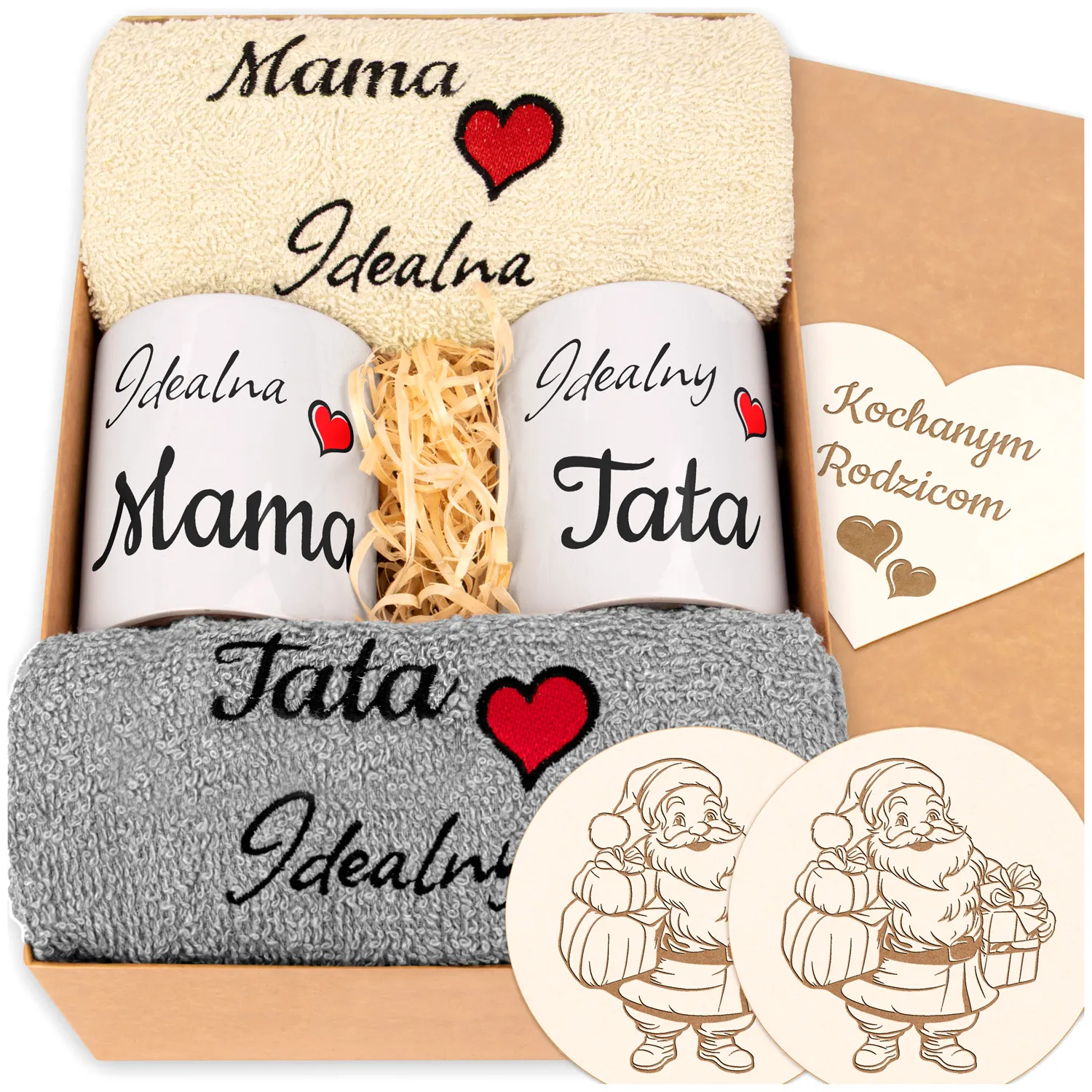 Zestaw składa się z dwóch eleganckich kubków z napisami „Idealna Mama” i „Idealny Tata” oraz dwóch miękkich, przyjemnych w dotyku ręczników, które doskonale sprawdzą się na co dzień. Całość tworzy harmonijne połączenie elegancji i ciepła, idealne na rodzinne święta.