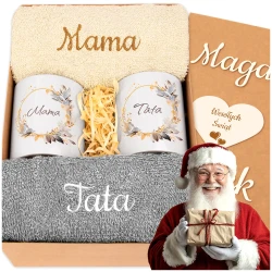 Zestaw składa się z dwóch eleganckich kubków z napisami „Idealna Mama” i „Idealny Tata” oraz dwóch miękkich, przyjemnych w dotyku ręczników, które doskonale sprawdzą się na co dzień. Całość tworzy harmonijne połączenie elegancji i ciepła, idealne na rodzinne święta.