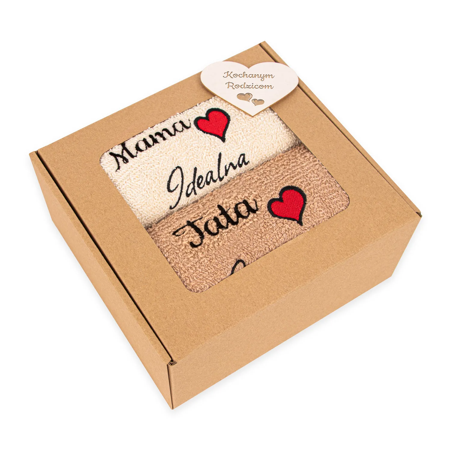 pudełko z okienkiem z ręcznikami + grawerowana zawieszka na skrzynce