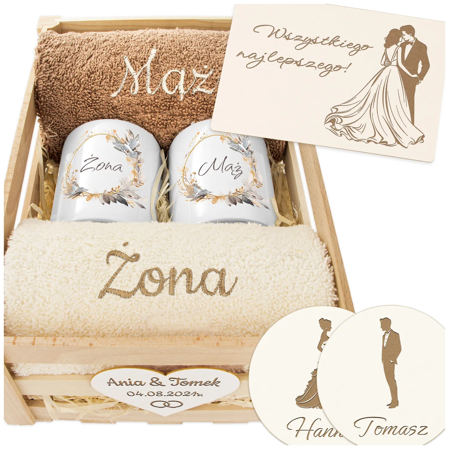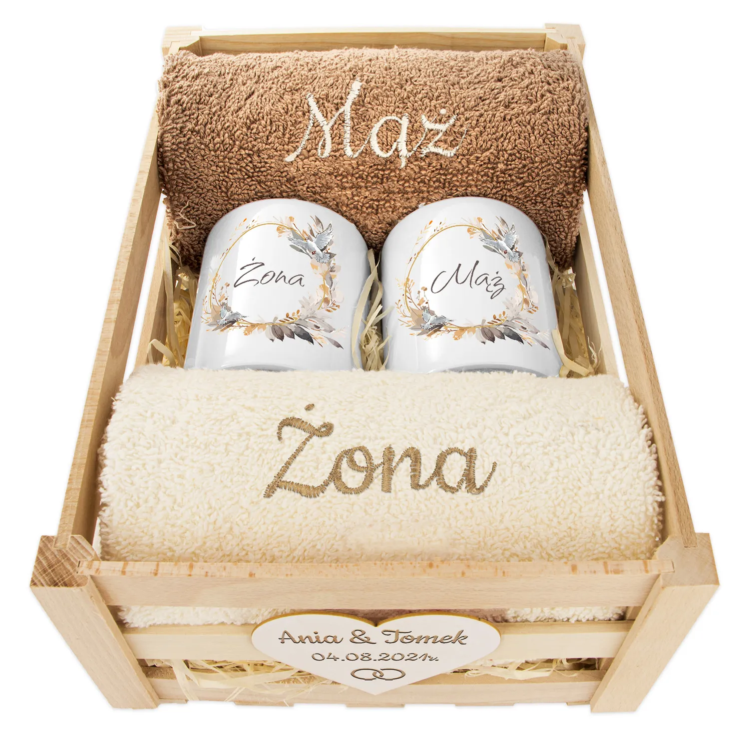 Prezent na Ślub Mąż i Żona – Ręczniki + Kubki w Drewnianej Skrzynce | Idealny na Ślub, Rocznicę, Jubileusz MZ1KolKrtDr2