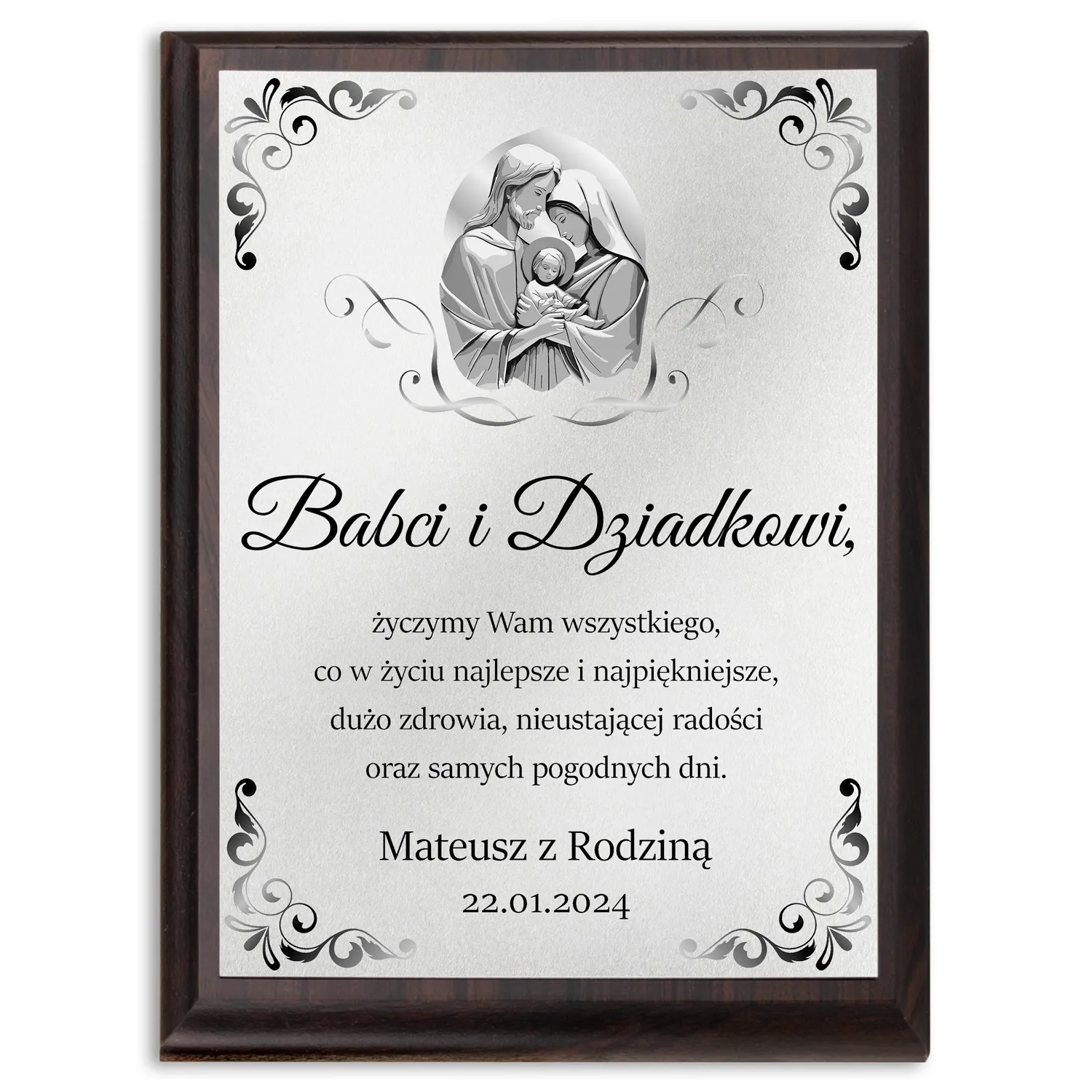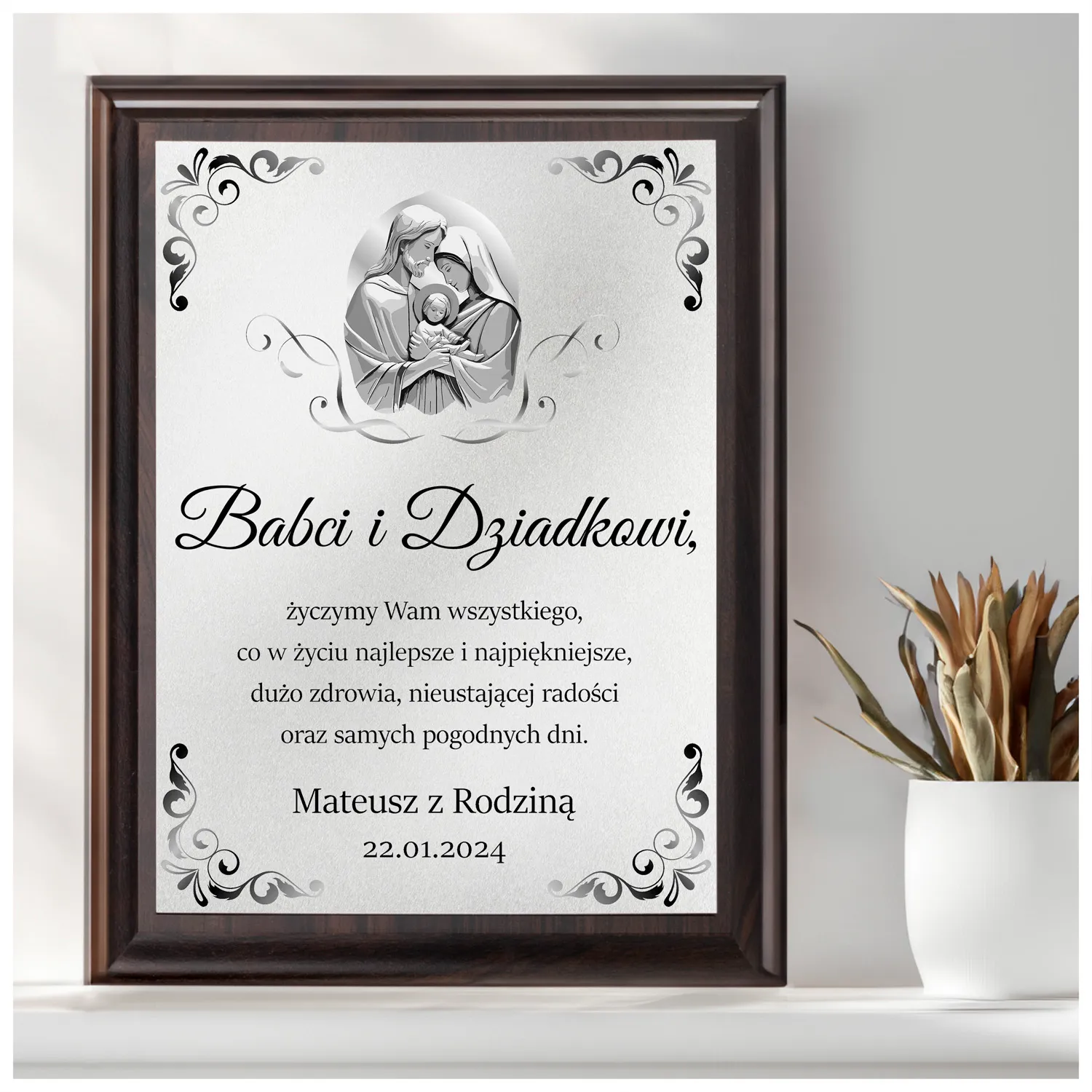 Chcemy, aby obrazek był jeszcze bardziej wyjątkowy, dlatego oferujemy opcję personalizacji. Możemy dodać imiona, datę oraz podpis wręczających osób, które umieścimy dyskretnie w obramowaniu. To sprawi, że Wasza pamiątka nabierze jeszcze głębszego znaczenia i stanie się nieodłączną częścią Waszej historii.